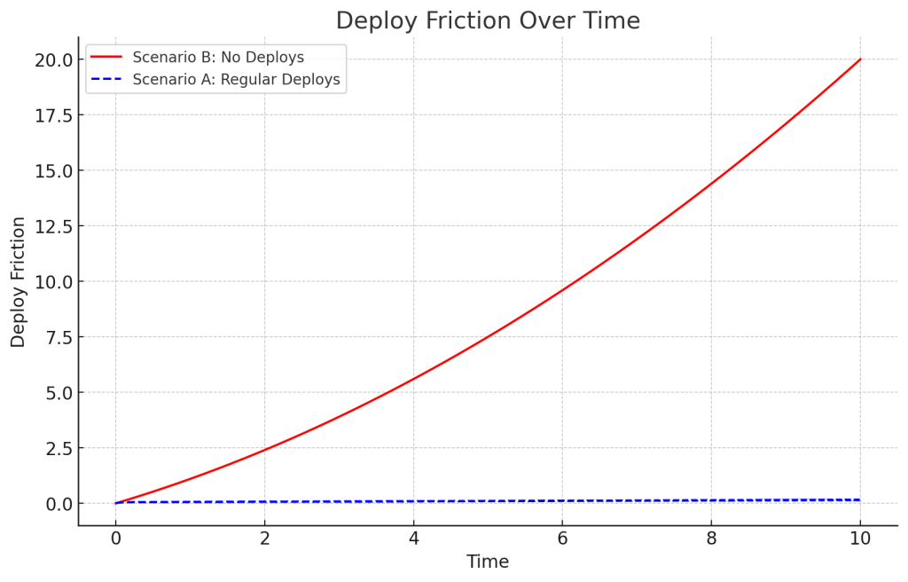 The quadratic term is used to capture the idea that growing undeployed features exponentially increase overhead. Thus, the formula for “Deploy Friction” at any time t can be given by: